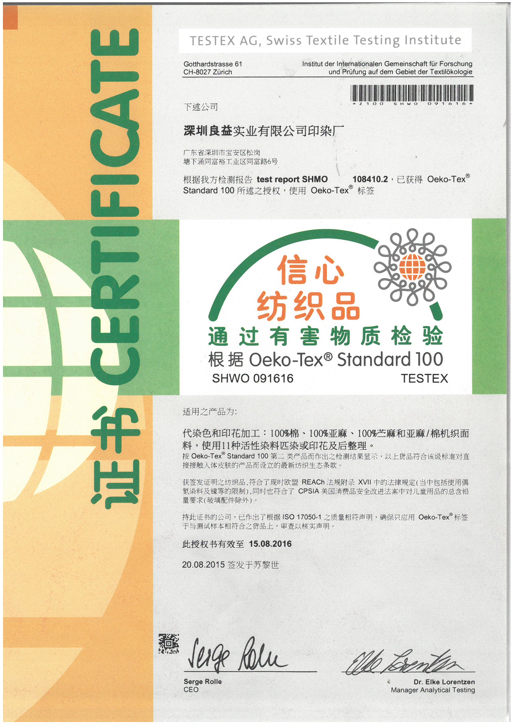 oeko-tex认证证书
